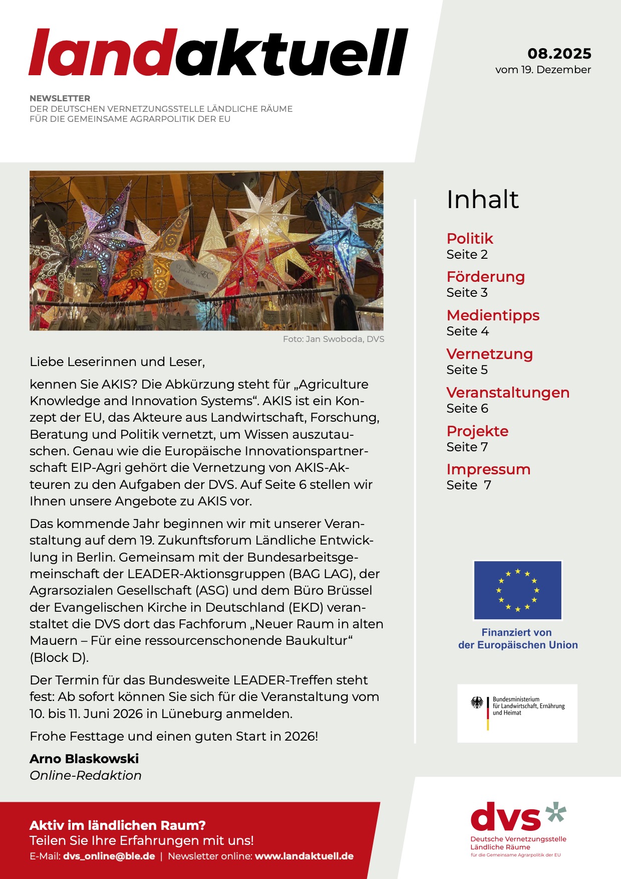LEADER steht im Mittelpunkt mehrerer Berichte: Die europäische Interessenvertretung ELARD setzt ihre Kampagne zur Sicherung von Bottom-up-Ansätzen in der Gemeinsamen Agrarpolitik fort. Das bundesweite LEADER-Treffen 2026 in Lüneburg wurde angekündigt, ebenso Workshops zur Demokratiearbeit in LEADER-Regionen. Praxisbeispiele, wie ein sportlicher Wettbewerb in der Region 9Plus und die Streuobsterfassung in Nordschwaben, zeigen die Vielfalt lokaler Projekte. Diese Aktivitäten stärken die Vernetzung, die regionale Identität und die nachhaltige Entwicklung ländlicher Räume.